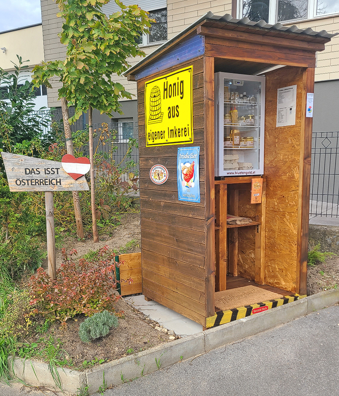 Einige Monate dauerten die Planungs- und Vorbereitungsarbeiten. Nun ging vor wenigen Tagen unsere Selbstbedienungs-Hütte direkt am Standort der Bio-Imkerei Obendorfer (Liechtensteinstraße 1, 2193 Wilfersdorf) in Betrieb. "Unsere wichtigsten Erzeugnisse – klassische Honigsorten, Propolis und frische Freiland-Eier – können nun auch 24/7 rund um die Uhr eingekauft werden", zeigt sich Imkermeister Ing. Franz Obendorfer sichtlich stolz. Lästiges Rechnen am Blockzettel entfällt, denn der Einkauf wird einfach am modernen Touchscreen-Kiosk erfasst und bargeldlos mit Karte bezahlt. Wenn jemand Hilfe benötigt, Honigwein kaufen möchte (Jugendschutz) oder ein Produkt gerade fehlt, gibt es im Häuschen eine Glocke mit der man beinahe zu jeder Zeit Unterstützung per Gegensprechanlage bekommt. Das neue SB-Konzept versteht sich als zusätzliche Einkaufsmöglichkeit, die volle Produktpalette gibt es weiterhin beim bestehenden Ab-Hof-Verkauf.