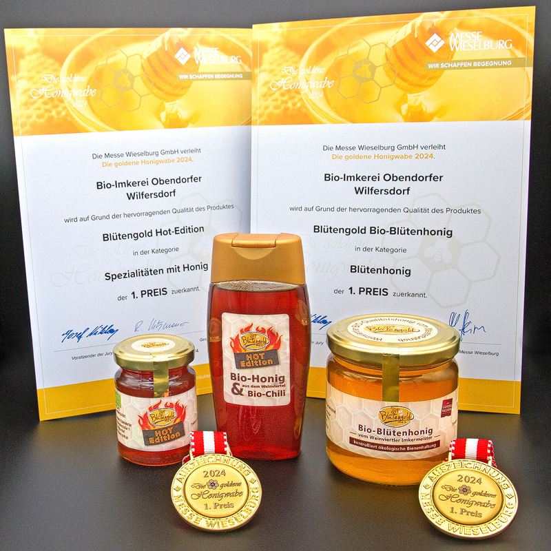 Das Jahresende naht, doch vorher jubeln wir noch über einen sensationellen Doppelerfolg bei der Honigprämierung der Messe Wieselburg. Unsere neue Kreation "Hot-Edition" haben wir heuer gerade erst vorgestellt und konnten schon eine Gold-Medaille damit erreichen. Das ist ein Marktstart, wie man ihn sich vorstellt. Nicht weniger freut uns jedoch, dass unser Allzeit-Klassiker "Blütengold Bio-Blütenhonig" ebenso mit einem 1. Platz ausgezeichnet wurde. Dieser Honig ist seit vielen Jahren bei unseren zahlreichen Partnern im regionalen Lebensmittelhandel eine der meistgefragten Sorten.