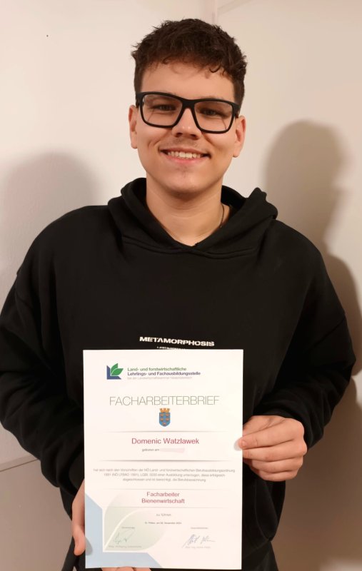 Nach drei Jahren Ausbildung freuen wir uns heute alle über den erfolgreichen Lehrabschluss unseres Mitarbeiters Domenic. Er hat heute in der Imkerschule Warth erfolgreich seine Abschlussprüfung abgelegt und darf sich von nun an Facharbeiter der Bienenwirtschaft nennen. Wir gratulieren herzlich und sehen seiner Rückkehr nach dem Präsenzdienst beim Bundesheer schon erwartungsvoll entgegen.
