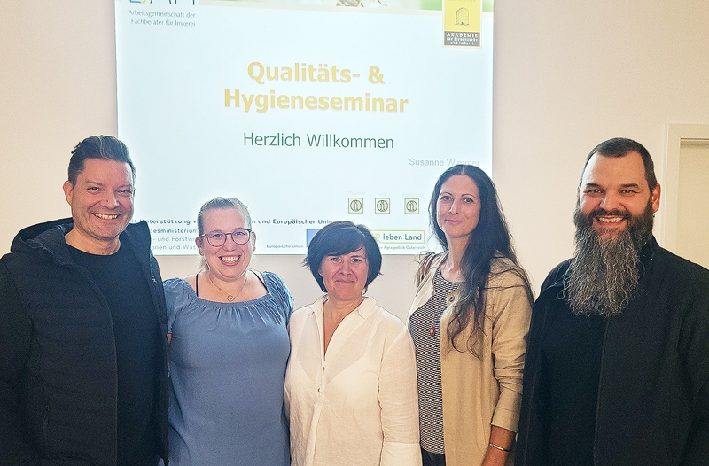 Wir nehmen unsere Sorgfaltspflichten gegenüber unseren Kunden ernst, deshalb war am 3. Mai war wieder einmal Fortbildung angesagt. Die Obfrau der Bezirksgruppe des NÖ Imkerverbandes, Ing. Gerlinde Wiesinger (2te von links), lud zu einem Qualitäts- und Hygieneseminar von Susanne Wimmer (Bildmitte), der Leiterin des Labors für Bienenprodukte und -gesundheit in Linz. Wir konnten bestehendes Wissen auffrischen und erfuhren über gesetzliche Neuerungen. Die Veranstaltung war sehr gut besucht und ein richtiger Treffpunkt der Imkerszene im Bezirk. Weiters am Bild unser Züchterkollege Imkermeister Robert Beck (links), sowie Imkermeister Ing. Franz Obendorfer (rechts).
