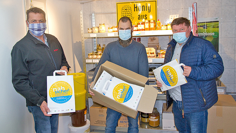 Anlässlich der "nah sicher!" Aktion haben Bürgermeister Tatzber und geschäftsführender Gemeinderat Obermayer MSc. unseren kleinen Ab-Hof-Verkauf besucht und uns mit den inzwischen allseits bekannten Papiertaschen versorgt.