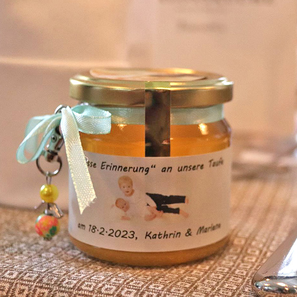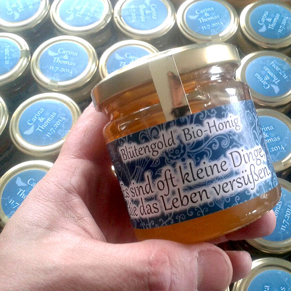 Als Besonderheit bieten wir Ihnen für Ihren Event eine spezielle Abfüllung mit individuellem Etikett an. Egal ob Hochzeit, Taufe, Weihnachtsfeier oder was auch immer Ihnen einfällt - mit einem süßen Präsent als Giveaway überraschen Sie alle Gäste oder Mitarbeiter und schaffen langfristige Erinnerungen. Ebenso als nachhaltiges Werbegeschenk im Rahmen einer Promotion sind unsere Bio-Honig Sonderabfüllungen bei Industrie und Wirtschaft sehr gefragt.